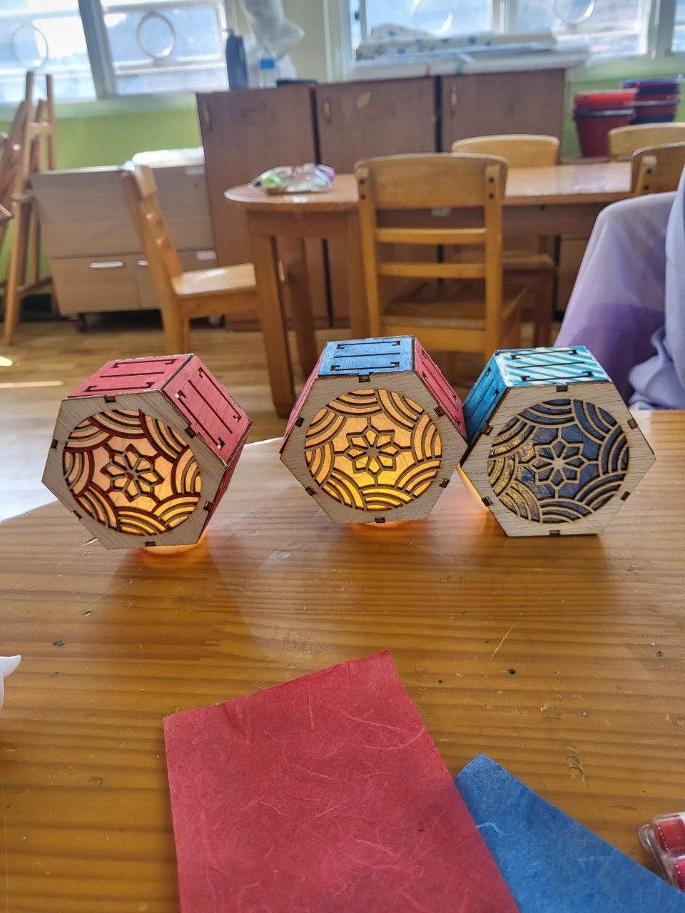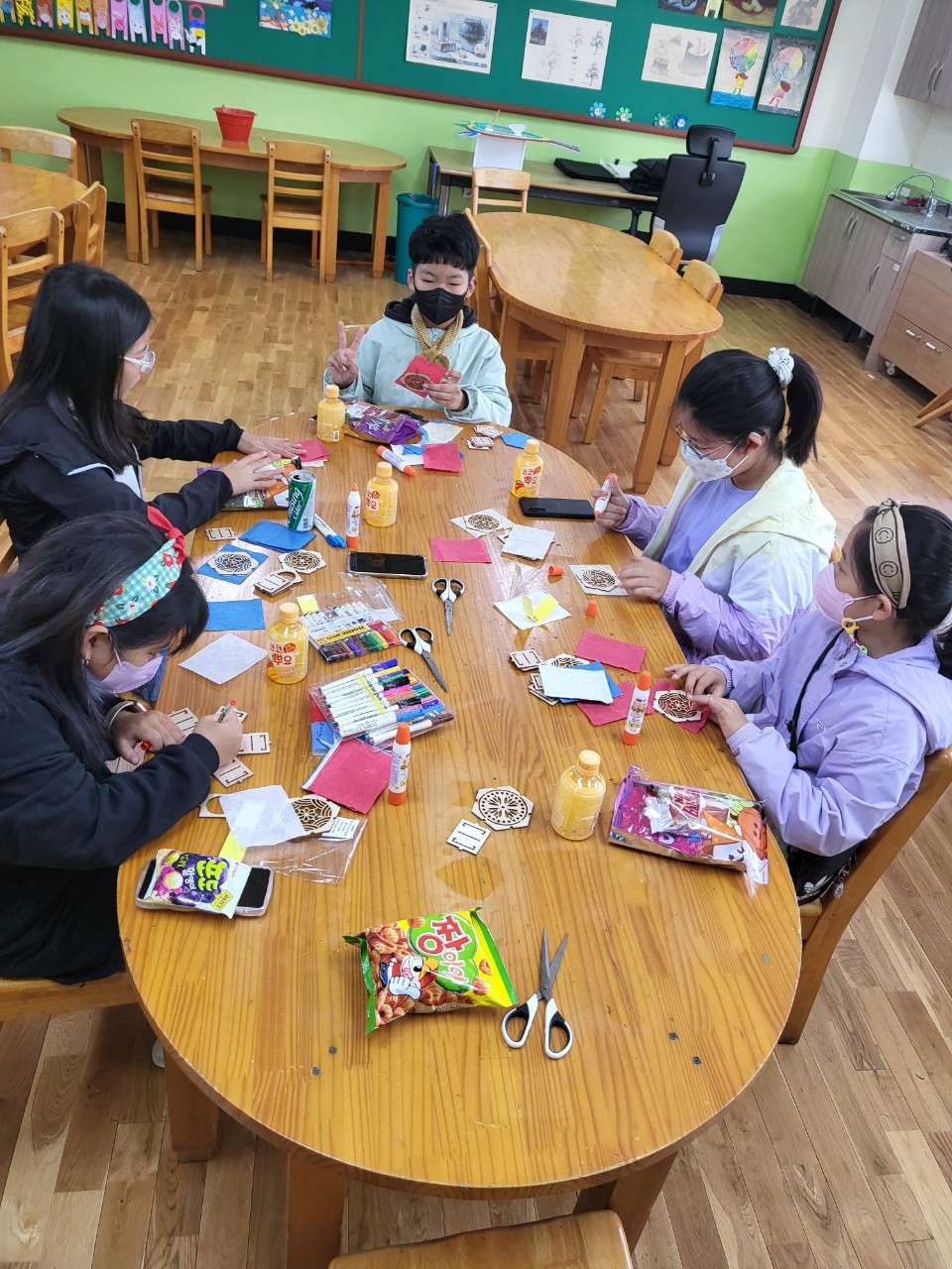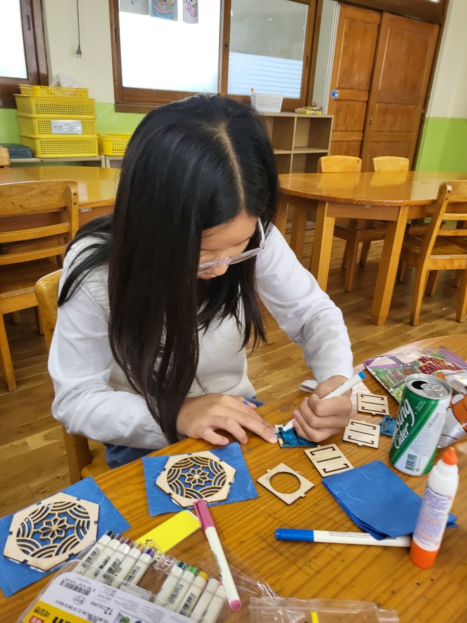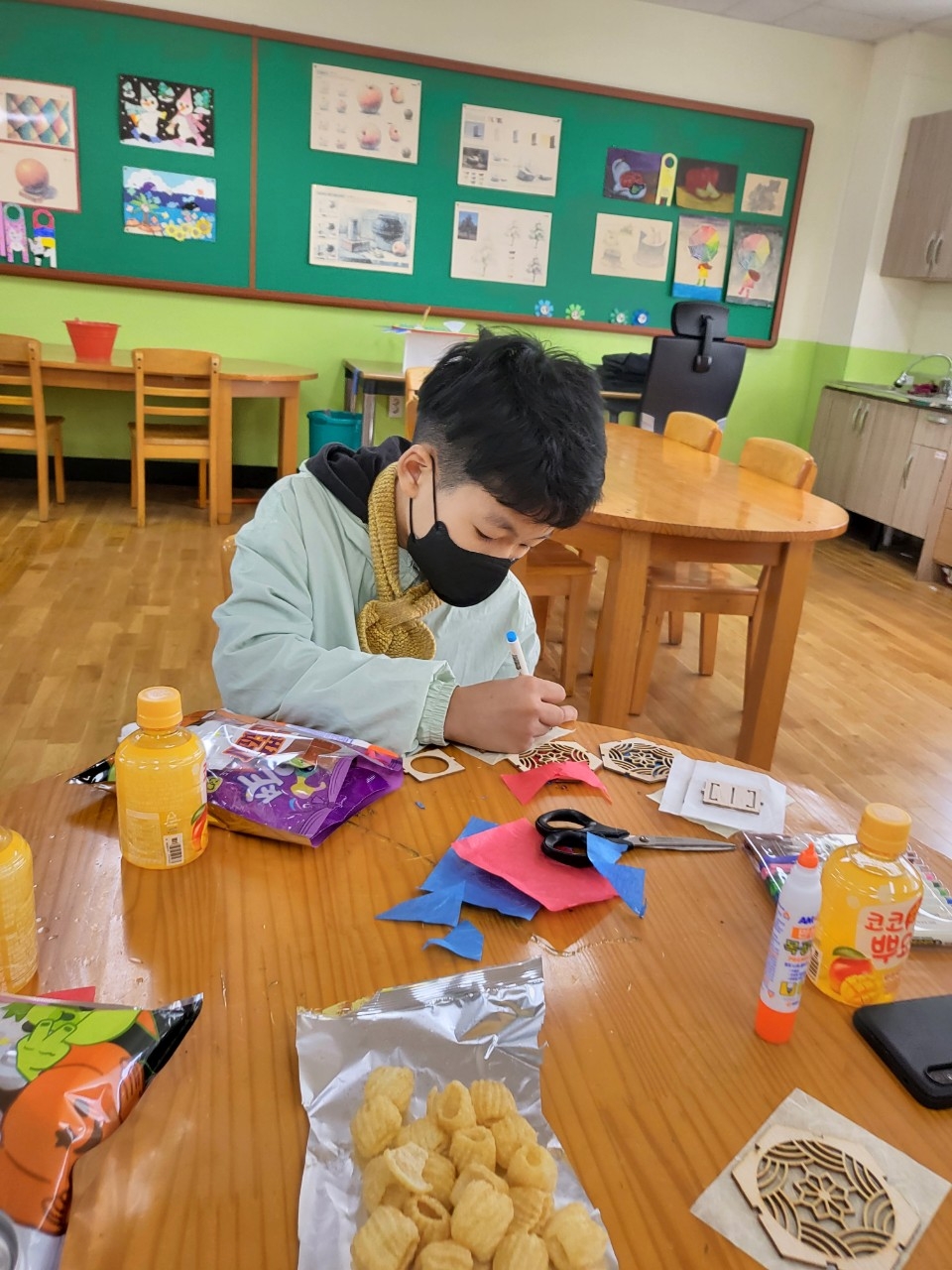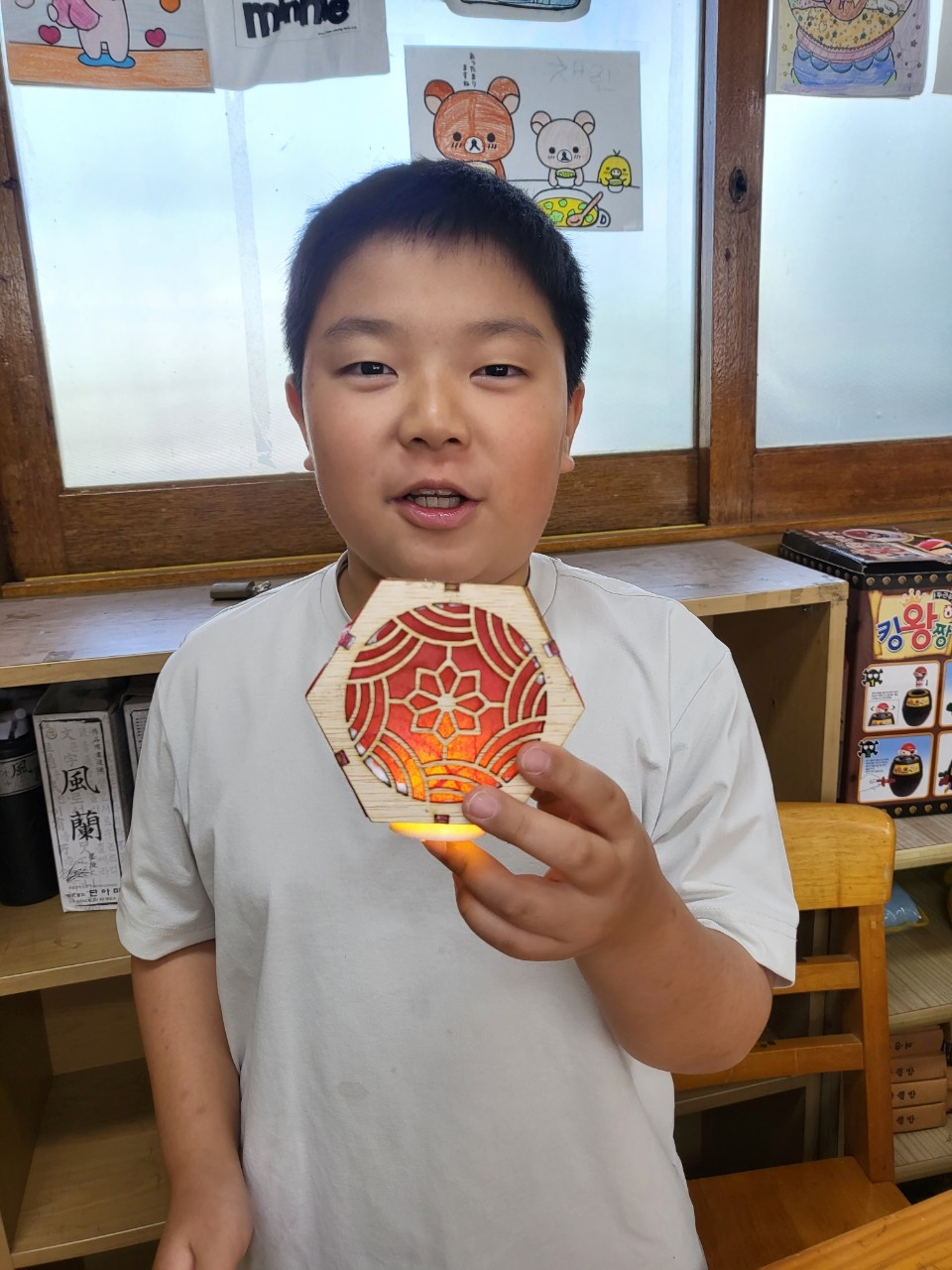 꼼지락꼼지락: 한지와 매직, 네임펜을 사용하여 전통문양 무드등을 만들었습니다.