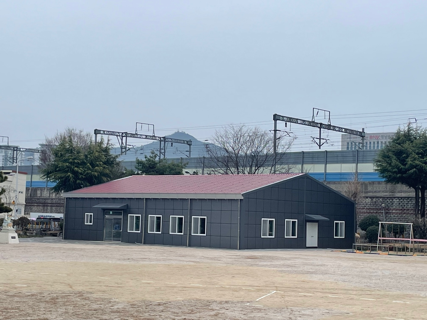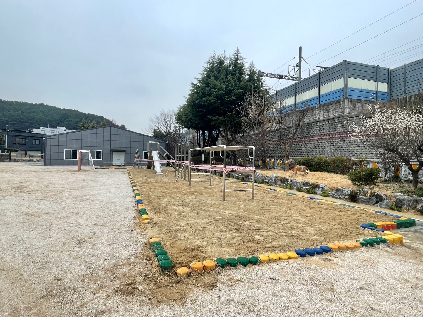 어린이 놀이시설은 이설로 인한 설치 검사 중이라 당분간 사용이 불가합니다.