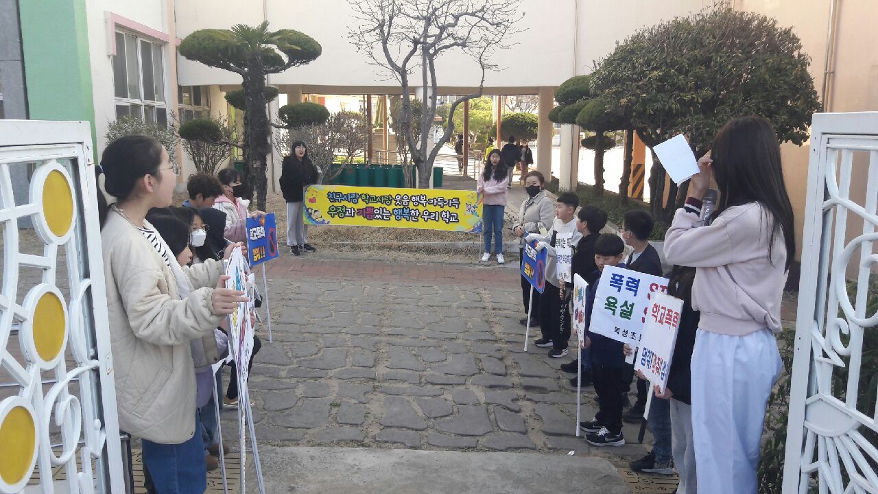 전교 임원 및 학급 봉사위원이 주축이 되어 실시한 학교폭력 멈춰 캠페인을 통해 안전하고 평화로운 학교 문화가 정착되기를 기대해 봅니다.